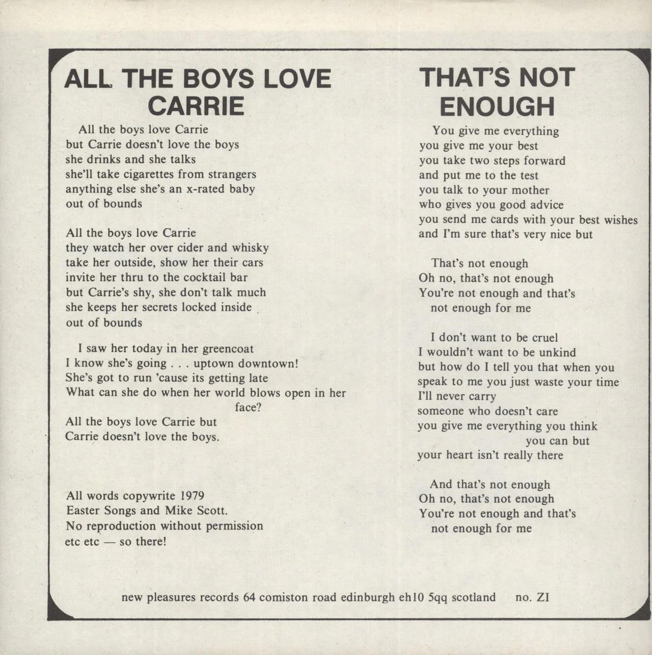 ANOTHER PRETTY FACE All The Boys Love Carrie (Rare 1st issue 1979 UK 2-track 7" vinyl single, featuring a pre-Waterboys Mike Scott, includes 'That's Not Enough', presented in green & white fold-out poster sleeve; both sleeve and recordare in Near Mint condition, the sleeve [printed on almost newsprint-type paper] has just a very minor [1cm] light stain on the reverse at the top! Z1)** First pressing of 1,000 copies! **
