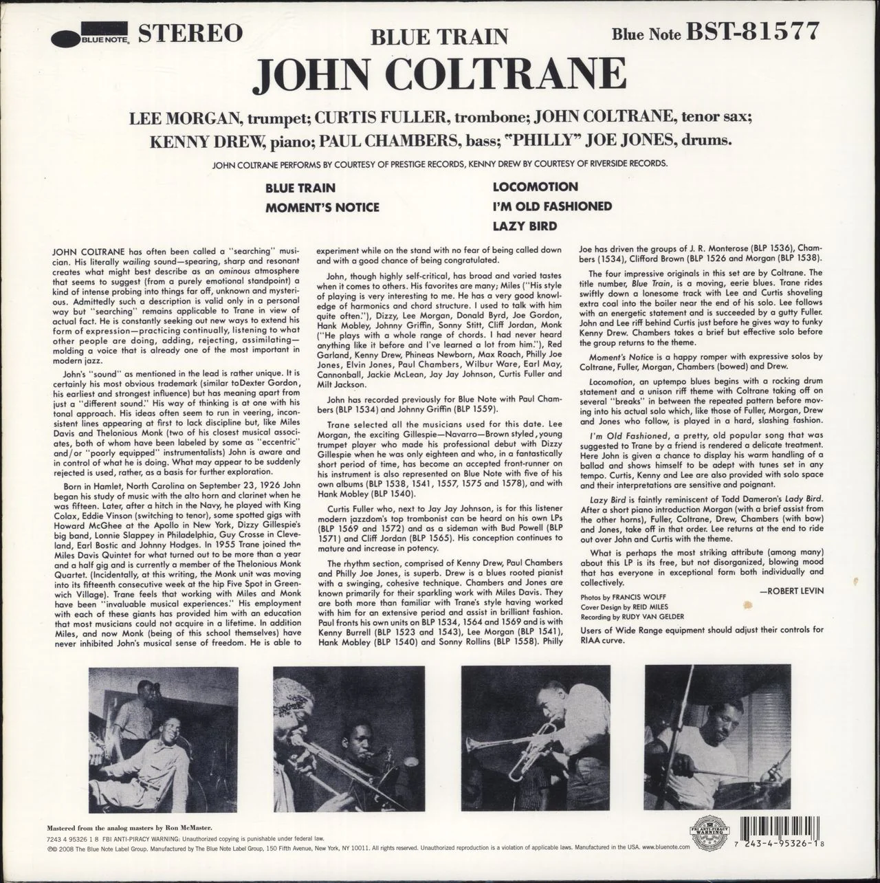 JOHN COLTRANE Blue Train (2008 US Blue Note 'Treasures' series issue of the classic 1957 5-track stereo vinyl LP, remastered from the original analogue tapes by Ron McMaster, picture sleeve replicating the original artwork BST-81577)