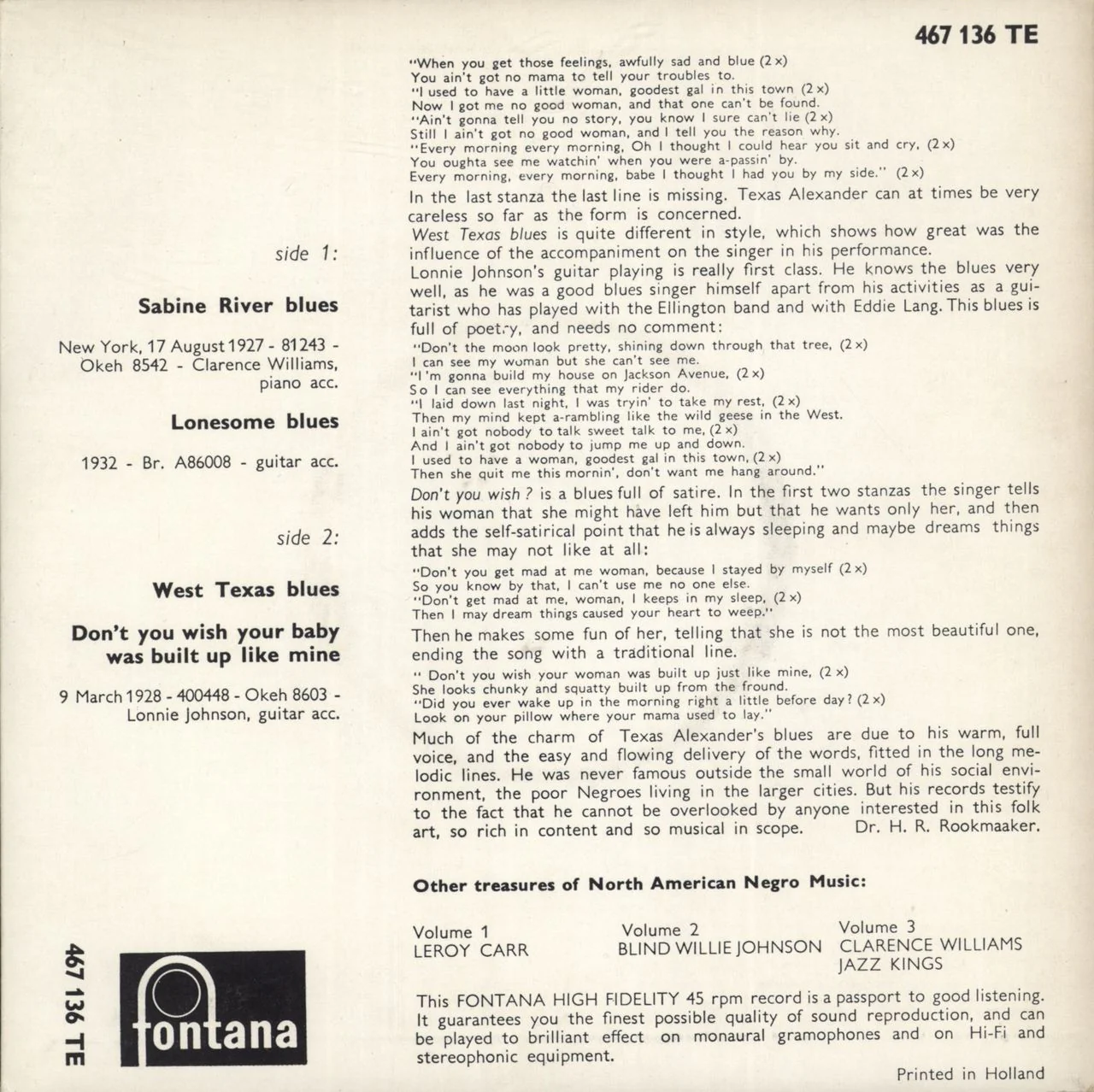 TEXAS ALEXANDER Treasures Of North American Negro Music Volume 7 (1950s Dutch 4-track 7" vinyl EP with wide centre, includes Sabine River Blues, Lonesome Blues, West Texas Blues and Don't You Wish Your Baby Was Built Like A Mine, gatefold picture sleeve with extensive sleevenotes. The sleeve shows minimal wear and the vinyl is Excellent & appears barely played)